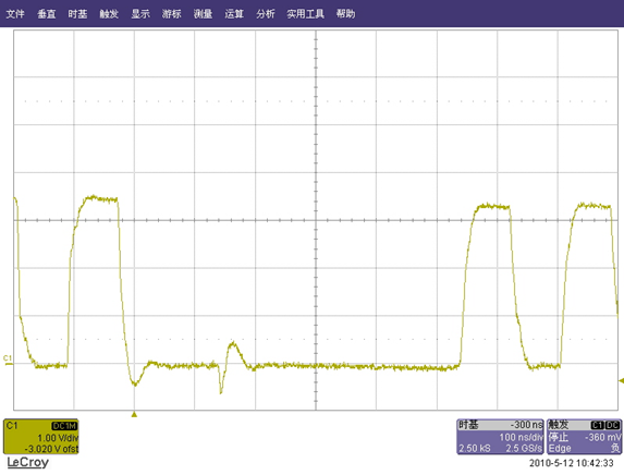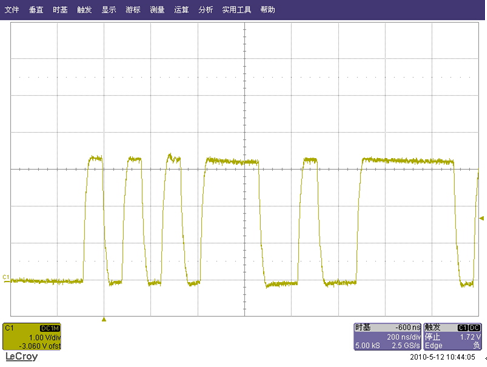 由于這些通信數(shù)據(jù)量的加大是突發(fā)出現(xiàn)的,用手動抓到的突發(fā)數(shù)據(jù)量波形很難剛好在時基觸發(fā)點附近,這樣波形放大后我們需要觀察的區(qū)域可能會無法滾進屏幕里,即使能滾進屏幕里,放大后的波形也可能由于時基、采樣等原因而失真的比較嚴重。而在一般情況下,我們都是考慮把觸發(fā)電平設置在如下圖“正統(tǒng)”的波形范圍里,但這樣也就抓不到“飛鳥”了: