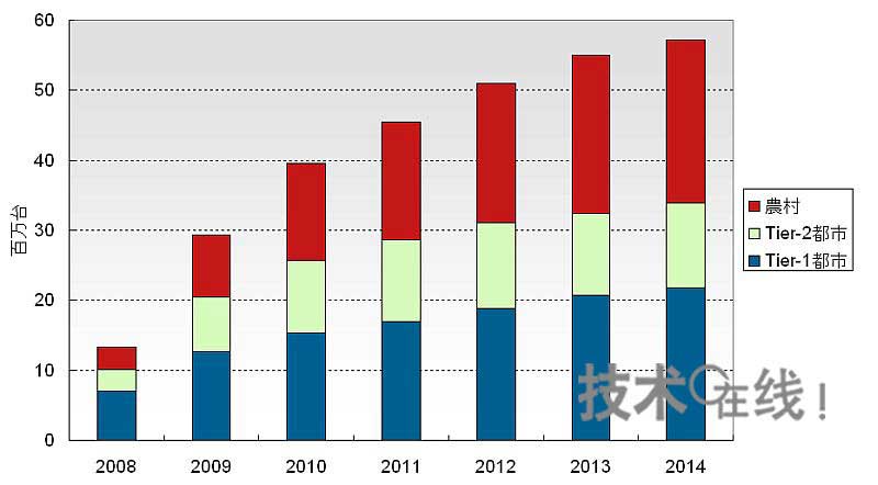 由于中國的城市人口不斷增加,2014年將超過中國人口的一半,達(dá)到56%,較10年前增長14%。我們首次將中國的液晶電視需求按照“一線城市”、“二線城市”及“農(nóng)村”的劃分進(jìn)行了預(yù)測。在農(nóng)村,目前正在由顯像管電視向平板電視過渡,一線城市和二線城市每戶家庭擁有的電視數(shù)量將增加。根據(jù)經(jīng)濟(jì)的增長程度,電視需求甚至有望超出預(yù)測。我們預(yù)測,2014年中國液晶電視需求中,城市約占60%,增長至3400萬臺左右(圖2)。