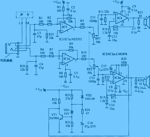 IC1及周圍元件組成緩沖放大級,電路增益=R4/(R1+R2)=50/(10+0.1)≈5倍。為了避免在電腦關(guān)機后,在聲卡停止工作時,前置放大器輸入端懸空,處于高阻抗輸入狀態(tài),將感應(yīng)到的50Hz交流電信號送到后級電路放大,從而在揚聲器中出現(xiàn)較強的噪聲,特設(shè)置了22kΩ電阻R25、R26,這樣不但可以將輸入阻抗限制在22kΩ,避免前置電路工作在高阻抗?fàn)顟B(tài),還可以對50Hz感應(yīng)信號進行有效的抑制,提高整機信噪比。