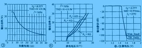 LM1876的負(fù)載范圍很寬,在4~30Ω的范圍內(nèi)均能穩(wěn)定地工作,其輸出功率與負(fù)載的對應(yīng)關(guān)系如圖5所示。LM1876的供電電壓范圍為±10~±25V,當(dāng)供電電壓降低時,影響的只是輸出功率的大小,而對其他指標(biāo)影響不大,供電電壓與輸出功率的對應(yīng)關(guān)系如圖6所示。LM1876的6、11腳為左/右聲道靜噪控制端,當(dāng)這幾腳接高電平(高于1.6V)時,LM1876內(nèi)部電路執(zhí)行靜音操作,切斷輸出端的音頻信號(如圖7所示)。因此可以在這些引腳中與正電壓之間接一個RC延時網(wǎng)絡(luò),使其在開機瞬間為高電平,輸出電路無音頻信號輸出,延時一段時間后,再正常輸出,以達到避免開機瞬間輸出端電位失諧對揚聲器的沖擊。在圖4中,晶體管VT1、R24、C16、R20、C15即為開機延時網(wǎng)絡(luò),調(diào)整它們的取值范圍,可以改變延時時間的長短,從而獲得滿意的開機延時時間。