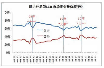 第一,內(nèi)外資品牌市場份額比例7:3左右(見圖2)。后金融危機時期,外資彩電品牌紛紛看好中國市場的發(fā)展,加大投入,推出低價產(chǎn)品沖擊國內(nèi)品牌市場份額。