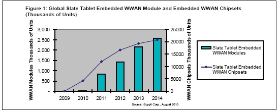 iSuppli公司預(yù)測,到2014年,slate型平板電腦市場的嵌入WWAN芯片組出貨量將達(dá)到2070萬個,而2009年幾乎是零。同時,到2014年slate市場的嵌入WWAN模塊出貨量將達(dá)到210萬個,而2009年出貨量也幾乎是零,其間的復(fù)合年度增長率高達(dá)498.4%。所謂的slate型平板電腦,包括蘋果公司的iPad。