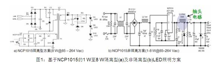 1W至8W的低功率LED通用照明應(yīng)用包括G13、GU10、PAR16、PAR20和嵌燈等。這類(lèi)應(yīng)用的輸入電壓范圍在交流90至264 V之間,恒流輸出電流包括350 mA和700 mA兩種,能效要求為80%,還要求提供短路和過(guò)壓保護(hù)等特性。這類(lèi)應(yīng)用可以采用安森美半導(dǎo)體的NCP1015自供電單片開(kāi)關(guān)控制IC。該器件集成了固定頻率(65/100/130 kHz)電流模式控制器和700 V的高壓MOSFET,具備構(gòu)建強(qiáng)固的低成本電源所需的全部特性,如軟啟動(dòng)、頻率抖動(dòng)、短路保護(hù)、跳周期、最大峰值電流設(shè)定及動(dòng)態(tài)自供電功能(無(wú)需輔助繞組)等。NCP1015既可用于隔離型方案,也可用于非隔離型方案,見(jiàn)圖1。