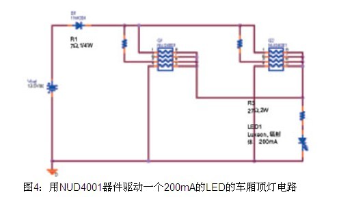 NUD4001提供了一種滿(mǎn)足汽車(chē)應(yīng)用的低成本解決方案。與采用線(xiàn)性或開(kāi)關(guān)穩(wěn)壓器相比,它的設(shè)計(jì)更簡(jiǎn)便,可以構(gòu)成更簡(jiǎn)單而且成本更低的電路,見(jiàn)圖4。