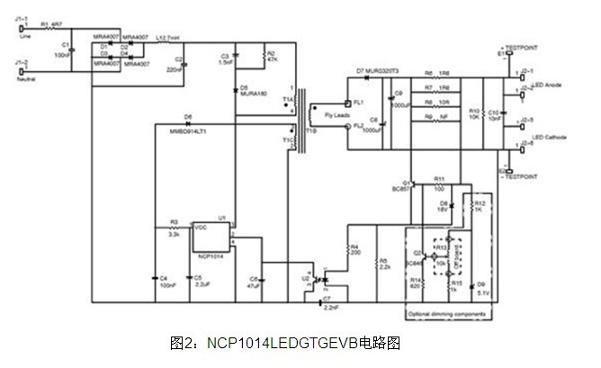 安森美半導(dǎo)體的NCP1014LEDGTGEVB評(píng)估板可驅(qū)動(dòng)1至8顆大功率高亮度LED。該設(shè)計(jì)基于集成了帶內(nèi)部限流功能的高壓電源開(kāi)關(guān)的緊湊型固定頻率脈寬調(diào)制(PWM)轉(zhuǎn)換器NCP1014構(gòu)建。由于NCP1014采用固定頻率工作,電流不能上升到高于某個(gè)特定點(diǎn);導(dǎo)通時(shí)間的限制使輸入電流將跟隨輸入電壓的波形,從而提供更高的功率因數(shù)。評(píng)估板電路圖見(jiàn)圖2。