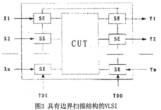 邊界掃描的基本思想是在靠近待測器件的每一個輸入/輸出管腳處增加一個邊緣掃描單元,并把這些單元連接成掃描鏈,運用掃描測試原理觀察并控制待測器件邊界的信號。在圖3中,與輸入節(jié)點X1,X2…、Xm和輸出節(jié)點Y1,Y2…、Ym連接的SE即為邊界掃描單元,它們構(gòu)成一條掃描鏈(稱為邊界掃描寄存器一BSR),其輸入為TDI(TestDataInput),輸出TD0(TestData0ut)。在測試時由BSR串行地存儲和讀出測試數(shù)據(jù)。此外,還需要兩個測試控制信號:測試方式選擇(TestModeSelect—TMS)和測試時鐘(TestC1ock—TCK)來控制測試方式的選擇。