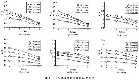 圖2示出了天線f2/f1隨各彎折節(jié)線長Ln的變化情況。圖2中,W=58mm,L=38mm,LG=17mm,HB=3mm,S1=S2=S3=1mm,W1=W2=W3=2mm。