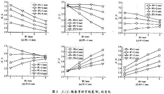 圖3給出了天線f2/f1隨著各彎折節(jié)線寬Wn的變化情況。圖3中,W=58mm,L=38mm,LG=17mm,HB=3mm,Sl=S2=S3=1mm,L1=L2=L3=5mm。與圖2中隨彎折節(jié)線長Ln的變化相比,f2/f1隨彎折節(jié)線寬Wn的變化較為復(fù)雜。