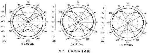 圖6示出了非均勻彎折線單極子天線的回波損耗曲線。從圖中可以看出,仿真結(jié)果與實(shí)際測試結(jié)果比較吻合。低頻段測得的阻抗帶寬(S1-1<-10dB)約為O.5GHz(2.2~2.7GHz);高頻段實(shí)際測得的阻抗帶寬(S11<-10dB)約為1.8GHz(4.48~6.28GHz)。圖7(a)~(c)分別示出了非均勻彎折線單極子天線在2.442GHz,5.25GHz和5.775GHz時(shí)的增益圖,增益分別為0.7dBi,1.65dBi和2.3dBi。