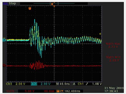 基本上,由于客戶有好的連接器結(jié)構(gòu)和PCB設(shè)計,當雷擊發(fā)生時,它能通過結(jié)構(gòu)和PCB設(shè)計釋放,從這個+6KV雷擊測試結(jié)果看,我們發(fā)現(xiàn)波形看起來像振鈴,在PHY端鉗位電壓非常低,這說明大部分雷擊能量已被釋放,這時能很好的保護PHY芯片。