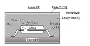 圖5中陰影部分為硅膠、樹脂等灌封料,其作用主要有兩個:一方面用于固定半成品;另一方面用于傳導(dǎo)功率器件表面的溫度(散熱)。所以從結(jié)點到環(huán)境的熱阻RthJA就可以表示為:
