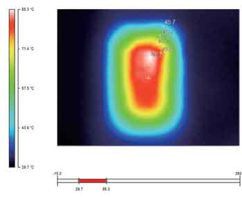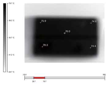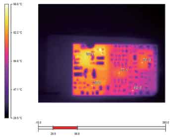圖6~9是利用Ti20拍攝的金升陽公司12W產(chǎn)品的熱圖像。通過這些圖片,我們不僅可以清晰地看出整體的熱分布(相同的溫度,所用的顏色是一致的),還可以借助其提供的軟件分析每一個元器件此時對應(yīng)的溫度值,如幾個溫度相對較高的元器件的溫度值分別如表1所示。