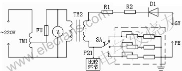 圖中TM1為調(diào)壓器,TM2為高壓變壓器,TM2產(chǎn)生的高壓經(jīng)高壓二極管D1整流得到0~3萬(wàn)伏(峰值電壓)的直流高壓。高壓電阻R1、R2為限流電阻,我們以電壓表V來(lái)間接指示實(shí)際的高壓值,也就是以高壓變壓器TM1初級(jí)的低壓送入電壓表,其表頭上指示的電壓數(shù)值是根據(jù)高壓變壓器初、次關(guān)系換算后的高壓值。這樣處理既可節(jié)約成本又可保證安全。本設(shè)備將P21點(diǎn)電壓送至另一比較環(huán)節(jié),此電壓與設(shè)定的泄漏電流比較來(lái)控制是否聲光報(bào)警,以此剔除不合格品。由于電池殼的材質(zhì)略有不同,空氣濕度也有變化,各種因素都可能引起合格電池殼情況下P21點(diǎn)的電壓發(fā)生微小變化,這種變化已足以導(dǎo)致設(shè)備誤判斷。為了解決這種問題,我們?cè)谥骰芈分写肓瞬煌碾娮?虛線框中),以調(diào)節(jié)旋鈕SA來(lái)作出選擇,用以抵消各種影響,可避免設(shè)備的誤判斷。