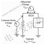 負(fù)載或電源的低壓側(cè)或高壓側(cè)都可進(jìn)行電流檢測(cè)。共模電壓是指分路(shunt)上的電壓(不是分路上的差分電壓),在低壓側(cè)檢測(cè)為零伏。低壓側(cè)檢測(cè)最簡(jiǎn)單,可采用最基本的放大器電路。低壓側(cè)檢測(cè)的難點(diǎn)在于:低壓側(cè)檢測(cè)會(huì)影響系統(tǒng)的接地端,可能還需要增加更多的線路,而且這種作法通常不利于故障診斷。圖1中的高壓側(cè)分路放大器可檢測(cè)很高的電源電壓上極低的差分電壓(通常為100mV或更低),通常在車載應(yīng)用中為13.8V。不過,如果為無限制的(unconditioned)電池線路,那么會(huì)受瞬變影響:如果無意中將電池方向放錯(cuò)就會(huì)出現(xiàn)–13.5V的情況,如果出現(xiàn)負(fù)載突降或感應(yīng)反沖,那么最大瞬變可達(dá)72V。不妨設(shè)想,放大器通常采用5~12V的單電源供電(5V的電源供電日益常見),這就需要放大器的輸入引腳連接到共模電位,大大超過了放大器電源軌的限制。