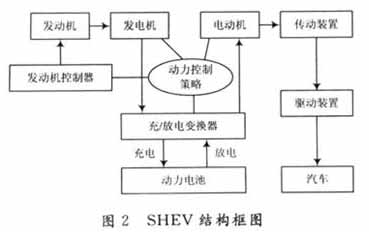 混合動(dòng)力電動(dòng)汽車由發(fā)動(dòng)機(jī)和蓄電池共同提供動(dòng)力,發(fā)動(dòng)機(jī)和電動(dòng)機(jī)可進(jìn)行不同組合得到不同的驅(qū)動(dòng)方案,如:串聯(lián)、并聯(lián)及混聯(lián)。整車性能的好壞不僅與發(fā)動(dòng)機(jī)和電動(dòng)機(jī)等部件有關(guān),還與其控制策略和優(yōu)化方法有關(guān)。按照能源組合的方式,混合動(dòng)力電動(dòng)汽車可按動(dòng)力驅(qū)動(dòng)方式分為串聯(lián)式混合動(dòng)力電動(dòng)汽車(SHEV)和并聯(lián)式混合動(dòng)力電動(dòng)汽車(PHEV)。