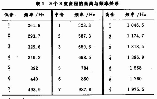 分析表1可見(jiàn),表中3個(gè)不同音程相同音名(同一行)的信號(hào)頻率都相差一倍。