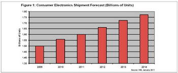 預(yù)計(jì)2011年消費(fèi)電子產(chǎn)品出貨量將達(dá)到16億個(gè),而2010年是15.6億個(gè)。消費(fèi)電子包括多種我們熟悉的產(chǎn)品,消費(fèi)者每天都會(huì)用到,如電視、立體聲和音頻部件、便攜媒體播放器、機(jī)頂盒、游戲機(jī)、DVD和藍(lán)光播放器、數(shù)碼相機(jī)、投影儀和攝像機(jī)、數(shù)字相框、電子書(shū)閱讀器和消費(fèi)電器。