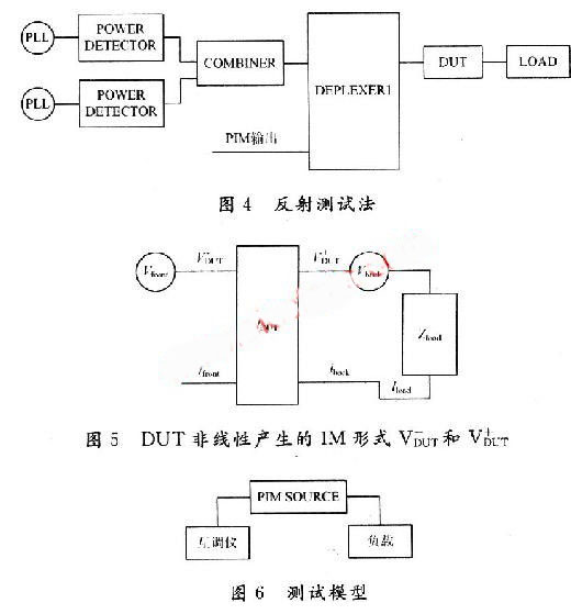 該系統(tǒng)中兩個(gè)大功率載頻f1和f2通過雙工濾波器發(fā)射到DUT,終端接50 Ω負(fù)載。PIM產(chǎn)生的雜散信號(hào)在DUT中產(chǎn)生,并在兩個(gè)方向傳播——“前向”到匹配負(fù)載,“反向”到雙工濾波器。發(fā)射激勵(lì)信號(hào)的頻率和被測(cè)的IM產(chǎn)物的頻 率由雙工濾波器的TX和RX通道決定。接收機(jī)測(cè)量反向傳播的IM波功率。