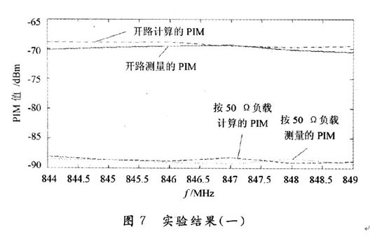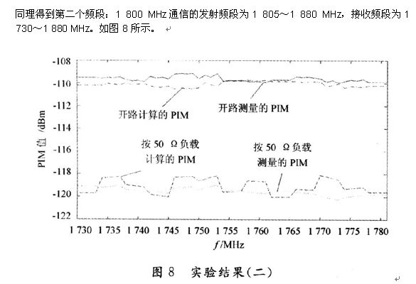 為了驗(yàn)證該方法的有效性,本文給出了兩個(gè)頻段的PIM值的計(jì)算與測(cè)量結(jié)果對(duì)比。頻段l:800 MHz的通信系統(tǒng)的發(fā)射頻段為869~894 MHz,接收頻段為824~849 MHz。如圖7所示。