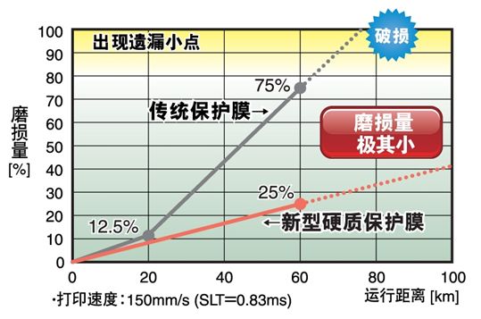 為了應(yīng)對(duì)這種情況,采取了將打印頭的保護(hù)膜材料變更為硬質(zhì)材料等對(duì)策,但提高保護(hù)膜的強(qiáng)度的課題是保護(hù)膜的組成和發(fā)熱部分的形狀設(shè)計(jì)。在以往的產(chǎn)品中,使用某些劣質(zhì)熱敏紙時(shí),使用壽命僅10km左右,這當(dāng)然與打印機(jī)的使用頻率也有關(guān)系,但發(fā)生過(guò)幾個(gè)月左右就無(wú)法使用的案例。羅姆面對(duì)這種情況,一直致力于改善保護(hù)膜材料中的硬質(zhì)材料的結(jié)構(gòu)和打印頭結(jié)構(gòu)。這次開發(fā)的熱敏打印頭通過(guò)優(yōu)化保護(hù)膜材料的構(gòu)成物質(zhì)及其組成,大幅提高了耐磨性,實(shí)現(xiàn)了比以往產(chǎn)品高約3倍的耐久性(保證150km(以往產(chǎn)品是50km))。另外,通過(guò)提高保護(hù)膜的熱導(dǎo)率,打印效率也比以往改善了15%,同時(shí)還提高了打印質(zhì)量。而且,這種打印頭的形狀保持與以往產(chǎn)品完全相同,因此無(wú)需進(jìn)行打印機(jī)的設(shè)計(jì)變更,另外,這種規(guī)格還可以用于修補(bǔ)替換。