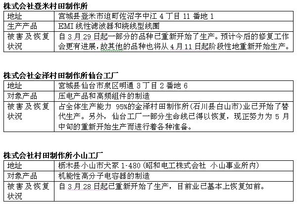 在之前,本網(wǎng)站曾報(bào)道過,截至23日18時(shí),日本東部大地震對(duì)日本村田制作所位于宮城縣和櫪木縣的三個(gè)受災(zāi)工廠的破壞程度。今天日本村田制作所再次發(fā)表聲明,告知三個(gè)受災(zāi)工廠的恢復(fù)程度。