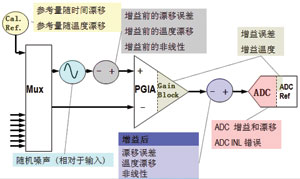 相對而言,精度的概念是指測量值與“真實”值之間的最大偏差的絕對值。如圖1所示,信號在整個數(shù)據(jù)采集系統(tǒng)中會受到參考量隨時間、溫度的飄移誤差、隨機誤差、非線性誤差、增益誤差等影響,這些影響綜合之后對測量結(jié)果所產(chǎn)生的影響就是我們所說的測量精度。