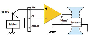 為了避免接地環(huán)路,需要選擇合適的接地模式,特別是在測量一個接地傳感器時,應(yīng)該盡量避免使用單端輸入方式(RSE),這種方式會直接在數(shù)據(jù)采集設(shè)備與傳感器地間產(chǎn)生電流。如果使用的是差分方式(DIFF),由于電路為開路,因此電流被制止,從而較好地抑制了接地環(huán)路。當然,相比于差分,通過隔離技術(shù)(見圖5),可以在不讓兩個地相連,分隔數(shù)據(jù)采集設(shè)備地的同時,保持數(shù)據(jù)值的傳輸,從而從根本上解決了環(huán)路問題.