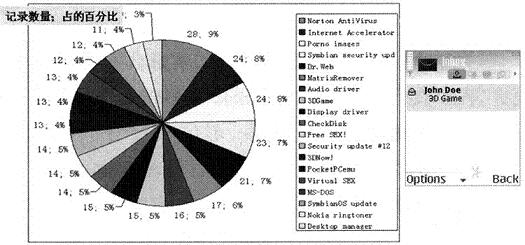 當(dāng)用戶打開含有CommWarrior病毒的MMS消息后,該病毒將在手機中進行安裝,并開始向手機號碼薄中的用戶隨機發(fā)送含有自身拷貝的MMS消息。同時,CommWarrior會偽造彩信主題進行傳播,通常包含著這樣的內(nèi)容“來自我的3D游戲!免費!”以及“適合所有型號諾基亞手機的鈴聲”等,使得接受彩信的用戶不會引起警覺,具體各類的消息內(nèi)容的比例如圖2所示。