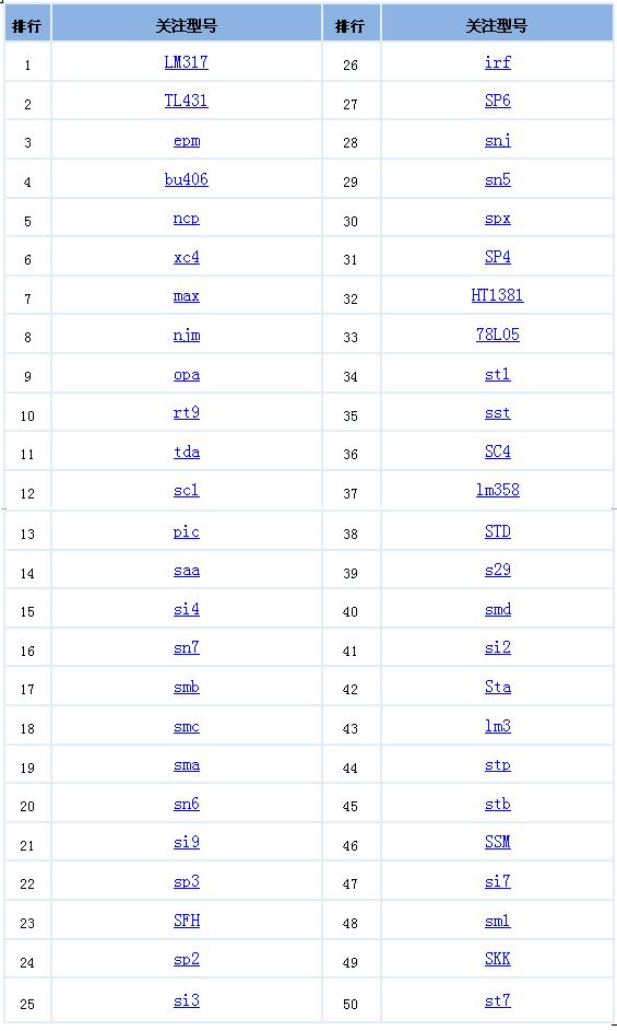 為客戶跑腿的除了快遞員,還可能是《華強(qiáng)電子》的小編?。?!為了客戶跑遍華強(qiáng)北的小編你更是傷不起!從這個(gè)月起,商戶們記得要盯緊《華強(qiáng)電子》了,小編將定期不辭辛苦地掃蕩華強(qiáng)北市場(chǎng),嘔心瀝血為廣大商家整理出一周熱門搜索排行榜!哪些IC型號(hào)最搶手,哪些獲得最多的詢價(jià),前50名讓你一目了然!如果您口味比較獨(dú)特,前50名沒有讓你感興趣的型號(hào),盡管來(lái)電咨詢,小編恭候您的電話。有更好的建議歡迎交流,求關(guān)注!求進(jìn)步!