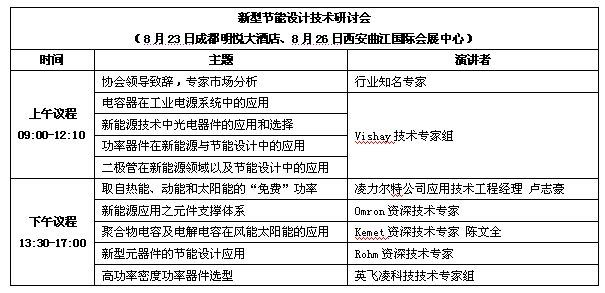 [page]新型節(jié)能設(shè)計(jì)技術(shù)研討會(huì)以風(fēng)能太陽能發(fā)電與節(jié)能設(shè)計(jì)為主題,圍繞智能電源、逆變器設(shè)計(jì)、智能控制、馬達(dá)控制、新型電子元器件與模塊的應(yīng)用展開探討,來自知名廠商的技術(shù)專家將分享逆變器設(shè)計(jì)、馬達(dá)控制、變頻技術(shù)、電力電子技術(shù)在風(fēng)能/太陽能、工業(yè)電子、通信設(shè)備、軍工上的應(yīng)用解決方案和節(jié)能設(shè)計(jì)技術(shù)。
