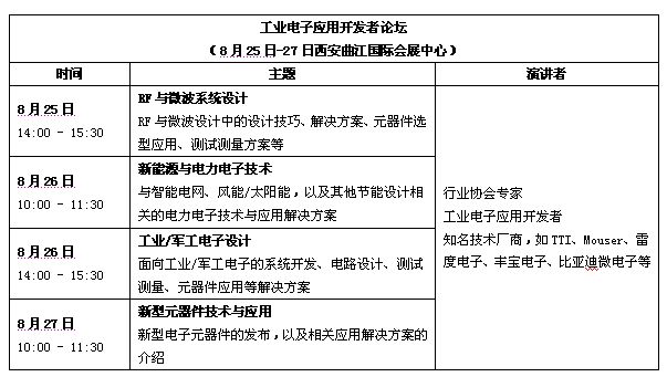 作為2011西部電子論壇中的一個(gè)新環(huán)節(jié),論壇組委會(huì)將聯(lián)合2011中國(西安)電子展,同期展會(huì)2號(hào)館推出工業(yè)電子應(yīng)用開發(fā)者論壇,該活動(dòng)是2011中國(西安)電子展中的核心活動(dòng)之一,聚焦以西安為中心的電子行業(yè)最為關(guān)注的RF微波、新能源以及工業(yè)應(yīng)用等主題,邀請研發(fā)一線的工程師與領(lǐng)先的技術(shù)廠商代表同臺(tái)展示設(shè)計(jì)新技術(shù)、新思路、新方案,為工業(yè)電子應(yīng)用開發(fā)者提供深入、平等交流的機(jī)會(huì)。