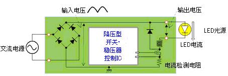 羅姆為了適應(yīng)上述市場(chǎng)需求而在進(jìn)行LED照明用驅(qū)動(dòng)器IC的開(kāi)發(fā)。為使LED保持一定的亮度點(diǎn)燈,需要有進(jìn)行恒流控制的LED驅(qū)動(dòng)器IC。通常,是從交流電源開(kāi)始進(jìn)行恒流控制,所以使用降壓型開(kāi)關(guān)穩(wěn)壓器方式(圖1)。
