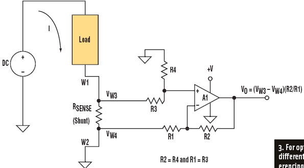為避免引入這樣的誤差,需要進(jìn)一步增加兩個(gè)措施:采用開爾文連接方式與分流電阻相連并加入一個(gè)差分輸入放大器。開爾文連接是一種帶有兩條激勵(lì)引線和兩條傳感引線的4線連接(圖2)。其中兩條線(W1和W2)是激勵(lì)引線,它們將分流電阻連接到該電路的大電流端。另外兩條線(W3和W4)為傳感引線,它們將分流電阻兩端的電壓連接到放大器。這個(gè)方式將攜帶負(fù)載電流的導(dǎo)線與測(cè)量電路分離開來,并把W1和W2中的電壓降從分流電阻兩端的電壓測(cè)量中清除。為了進(jìn)一步有效利用開爾文連接的優(yōu)點(diǎn),還需加入一個(gè)差分放大器(如圖3)。