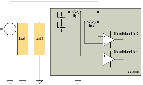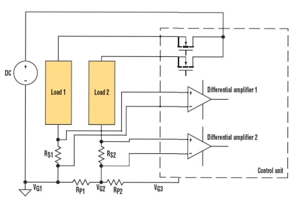 由于低端測(cè)量例子可能產(chǎn)生共模問題,這里考慮圖4所示的分布負(fù)載系統(tǒng)。虛線框中的控制單元使用MOSFET來控制輸送到兩個(gè)負(fù)載的功率。電源、負(fù)載和控制單元之間的寄生電阻RP1和RP2代表接地引線電阻和連接器電阻之和。在實(shí)際電路中,它們的數(shù)值可能為幾百毫歐。對(duì)于這個(gè)例子,假設(shè)RP1和RP2為0.2 Ω。差分放大器1和2與圖3中的差分放大器類似。