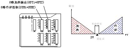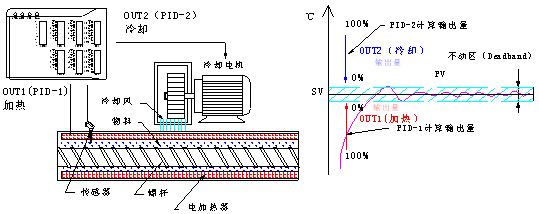 DTE10T在擴(kuò)展輸出模塊后,SUB1輸出口可定義為冷卻輸出控制。利用雙PID計算,在溫度沒有沖過設(shè)定值時,溫控器就可提前啟動冷卻風(fēng)機(jī),避免了溫度從高不下的情,并能保持溫度穩(wěn)定性。個人認(rèn)為報警驅(qū)動的冷卻模式總將由于控溫不穩(wěn)定等原因被淘汰。雙PID控制方式必定是追求更高控溫精度的首選。如圖5所示。