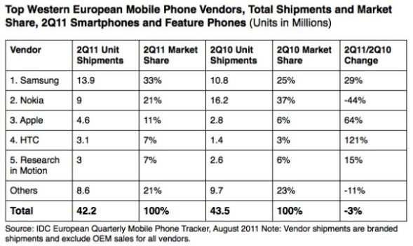 報(bào)告顯示,今年第二季度西歐地區(qū)移動(dòng)產(chǎn)品出貨總量同比下降3%。IDC分析師弗朗西斯科·杰若尼莫(Francisco JerONimo)表示,歐洲嚴(yán)峻的經(jīng)濟(jì)形勢(shì)以及諾基亞發(fā)貨量的直線下降是兩大主要原因。