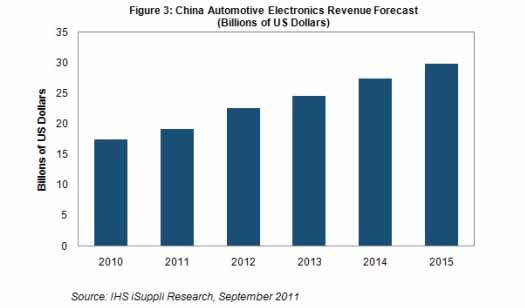 據(jù)IHS iSuppli公司的中國研究報告,2011年中國汽車電子市場銷售額預(yù)計將達到192億美元,比去年的175億美元增長9.7%。
