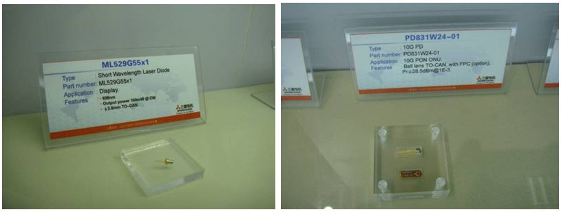 作為在光器件領域有著30多年豐富經(jīng)驗的光器件制造商,三菱電機也與時俱進,在此次展會上展示了100Gbps、40Gbps,還有持續(xù)快速發(fā)展的10Gbps領域的新產(chǎn)品。三菱電機用于10Gbps的EML同軸封裝新產(chǎn)品,功耗僅0.35W,真正體現(xiàn)了高性能、低功耗和體積小的優(yōu)勢。