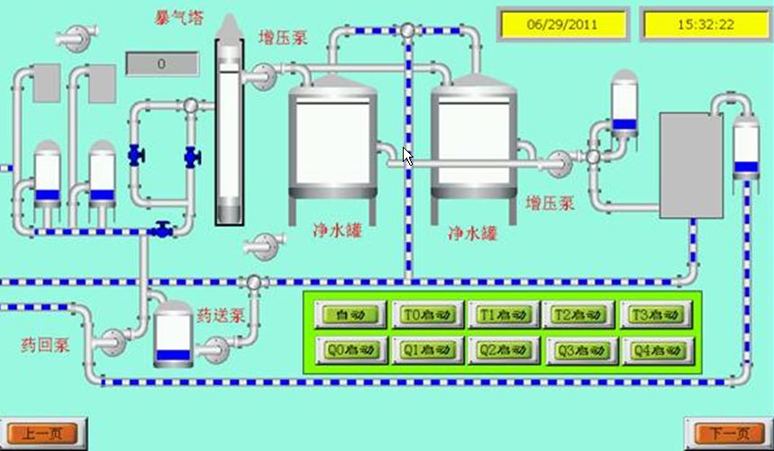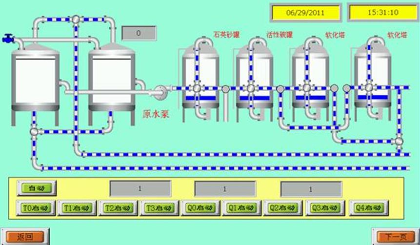 制藥用水是不含任何添加物的工藝用水。制藥用水的系統控制要控制這些雜質的含量,同時還要有效處理和控制微生物及細菌內毒素的污染。通常會采用離子樹脂交換、蒸餾冷凝、電滲析、反滲透等工藝方式。其制備流程大致分為五部分:預處理、初級除鹽裝置、深度除鹽裝置、后處理裝置、純水輸送分配系統。純化水設備包含機械部分和電氣部分:機械部分主要由水泵、壓力罐、水箱、電磁閥、過濾器和管路組成;電氣部分主要由可編程控制器(PLC)、觸摸屏、變頻器、壓力表、繼電器等組成。圖1為制備純化水的一個現場展示案例。