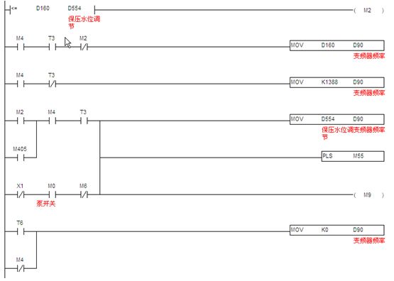 3.2.1測(cè)速程序:此部分程序原理就是采用PLC內(nèi)置的高速計(jì)算功能,計(jì)算單位時(shí)間內(nèi)從測(cè)速編碼器過來的脈沖數(shù),然后根據(jù)相關(guān)機(jī)械系數(shù)折算成線速度,這個(gè)值作為計(jì)算供水泵頻率的一個(gè)系數(shù),然后根據(jù)濕度設(shè)定值,計(jì)算出實(shí)際所需的供水頻率。見圖8。