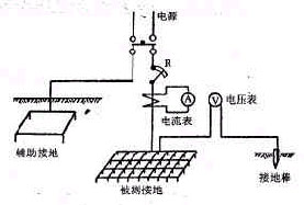 最初人們對(duì)接地電阻的測量是用伏、安法,這種試驗(yàn)是非常原始的。圖1是用安培計(jì)、伏特計(jì)的測量方法。在測定電阻時(shí)須先估計(jì)電流的大小,選出適當(dāng)截面的絕緣導(dǎo)線,在預(yù)備試驗(yàn)時(shí)可利用可變電阻R調(diào)整電流,當(dāng)正式測定時(shí),則將可變電阻短路,由安培計(jì)和伏特計(jì)所得的數(shù)值可以算出接地電阻。