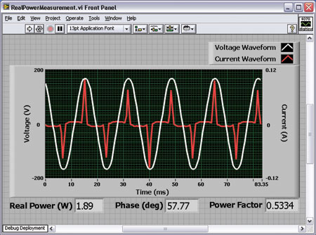 功率損耗的更精確描述可以通過測量設(shè)備的真實(shí)功率,或“近似功率”獲得,這種測量必須考慮信號的波形和相位。分析真實(shí)功率的方法之一是使用兩臺同步的PXI-4071 FlexDMM設(shè)備,每臺都具有采集電壓和電流波形速率高達(dá)1.8Ms/s的能力,并提供標(biāo)準(zhǔn)DMM的讀數(shù)方式。