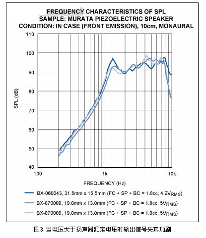 陶瓷揚聲器制造商通常規(guī)定了揚聲器的最大驅(qū)動電壓,典型值15VP-P。電壓最大時陶瓷器件的偏移量達到極限。外加電壓大于額定電壓時不會導(dǎo)致聲壓升高,反而增加了輸出信號的失真度。圖3為電壓最大時,陶瓷揚聲器輸出聲壓(SPL)與頻率的關(guān)系曲線。通過對比SPL與頻率的關(guān)系曲線圖以及阻抗與頻率的關(guān)系曲線圖,可以明顯看出壓電揚聲器產(chǎn)生高SPL時,在自激頻率處效率最高。