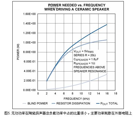 驅(qū)動10Ω串聯(lián)電阻的陶瓷揚聲器時,總負載功率中無功功率占的比重并不大。大部分功率耗散在外部電阻上,圖5為放大器功率與頻率的關(guān)系曲線。