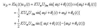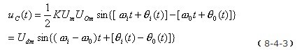 式中的ω0為壓控振蕩器在輸入控制電壓為零或?yàn)橹绷麟妷簳r(shí)的振蕩角頻率,稱為電路的固有振蕩角頻率。則模擬乘法器的輸出電壓uD為: