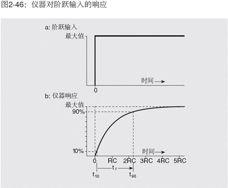 模擬儀器(或模擬輸出)的上升時(shí)間一般定義為輸入信號(hào)從零立即上升到某一固定值時(shí),輸出信號(hào)從最終值的10%上升到90%所需要的時(shí)間。此關(guān)系示于圖2-46。圖2-46a示出假定上升時(shí)間為零的階躍函數(shù),而圖2-46b示出儀器的響應(yīng)及相應(yīng)的上升時(shí)間。單極點(diǎn)系統(tǒng)(1階系統(tǒng))的上升時(shí)間、頻率響應(yīng)和RC常數(shù)是有關(guān)聯(lián)的。3dB點(diǎn)由下式給出: