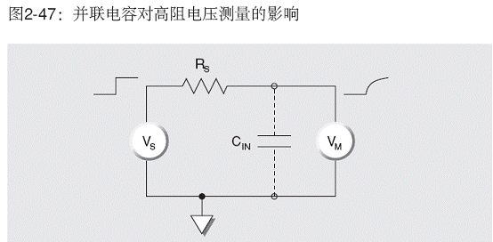 在對(duì)高阻抗源進(jìn)行電壓測(cè)量時(shí)(圖2-47),電壓表(VM)兩端的電容(CIN)必須通過RS充電。輸出電壓對(duì)時(shí)間的函數(shù)關(guān)系為: