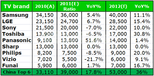 而今年Sharp以日本市場為主軸;Toshiba以日、歐為主要銷售地區(qū),年成長表現(xiàn)衰退;Sony銷售地區(qū)橫跨歐、美、日,除了區(qū)域性需求不振,加上其組織策略反映較緩慢,不僅財報未見起色,年度液晶電視出貨目標更呈現(xiàn)7%之衰退,下修至20百萬臺;Panasonic因購買Sanyo品牌,看似整體市占率提升,但內(nèi)部獲利壓力頗大,除打算出售位于日本茂原的六代廠,亦將減少8.5代廠的產(chǎn)能,后續(xù)仍須觀察;Philips以歐洲為主要市場,難幸免于歐債風暴沖擊;Vizio面臨與LGD之合作關系生變,加上北美市場不景氣,年度銷售量下滑幅度甚鉅;反觀大陸品牌挾帶雄厚資源,年度銷售量成長依舊維持在17~18%左右,市占率更達19~20%,2012更預估有3成之成長力道。