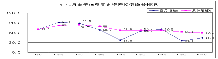 今年1-10月,電子信息產(chǎn)業(yè)固定資產(chǎn)投資持續(xù)高速增長(zhǎng),500萬(wàn)元以上項(xiàng)目完成固定資產(chǎn)投資7361億元,同比增長(zhǎng)60.1%,增速高于工業(yè)投資33.5個(gè)百分點(diǎn)。但從9月份開始,投資增速開始回落,9、10月份分別同比增長(zhǎng)35.6%和44.4%,增速低于8月份(70.8%)35.2和26.4個(gè)百分點(diǎn),同時(shí)10月份完成投資869.5億元,環(huán)比下降2.3%。