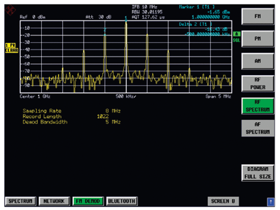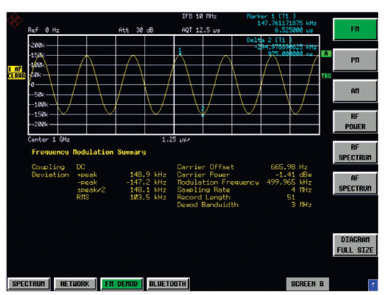 圖6是羅德與施瓦茨公司頻譜儀選件FS-K7在分析調(diào)頻信號(hào)的應(yīng)用。它采用上述解調(diào)原理,可以實(shí)時(shí)解調(diào)調(diào)頻、調(diào)幅、調(diào)相和實(shí)時(shí)頻譜。